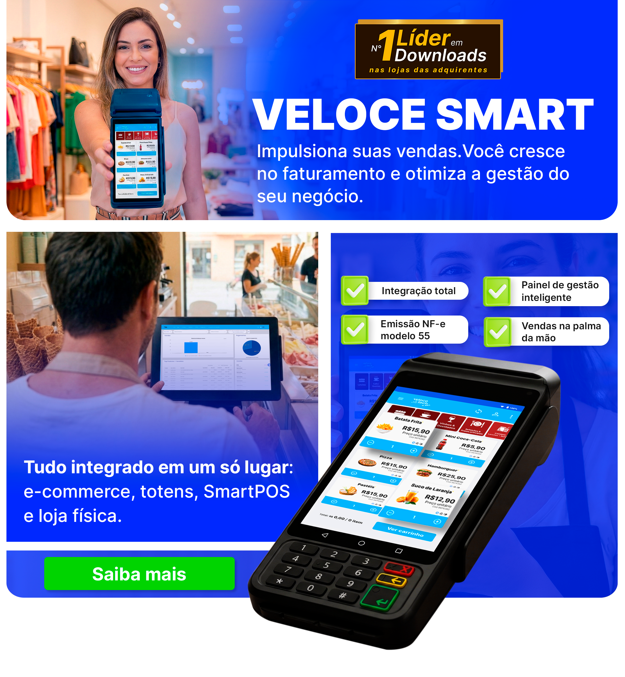A Veloce.Tech é especializada em soluções de vendas e formas de pagamento multicanais. Trabalhamos com as maiores adquirentes do Brasil. Somos pioneiros em tecnologias que transformam o mercado, com soluções para SmartPOS, dispositivos móveis, e-commerce, pagamentos online e autoatendimento (totens). Nas Soluções Veloce Pay, você encontra todas as formas de TEF, contingenciamento, conciliação.